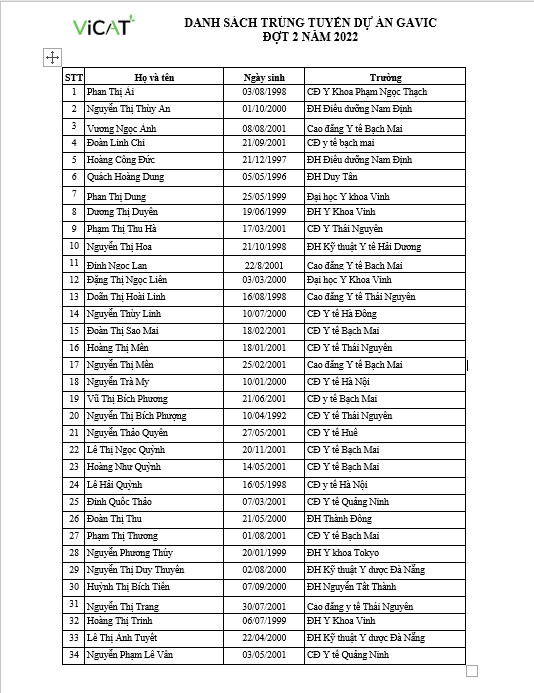 Tiến trình dự án Danh sách trúng tuyển dự án GAVIC – Đợt 2/2022 Posted on 06/12/202212/12/2022 by gavic
