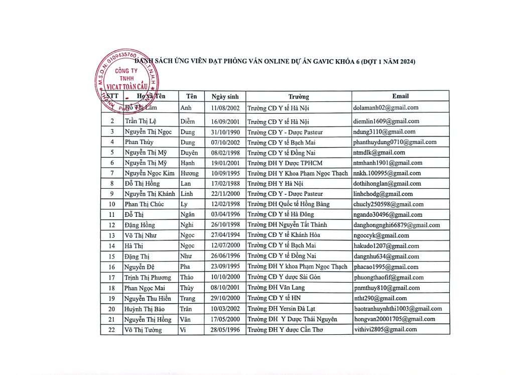 Tiến trình dự án Danh sách ứng viên đạt phỏng vấn online dự án GAVIC khóa 6 (Đợt 1/2024) Posted on 22/03/202422/03/2024 by gavic