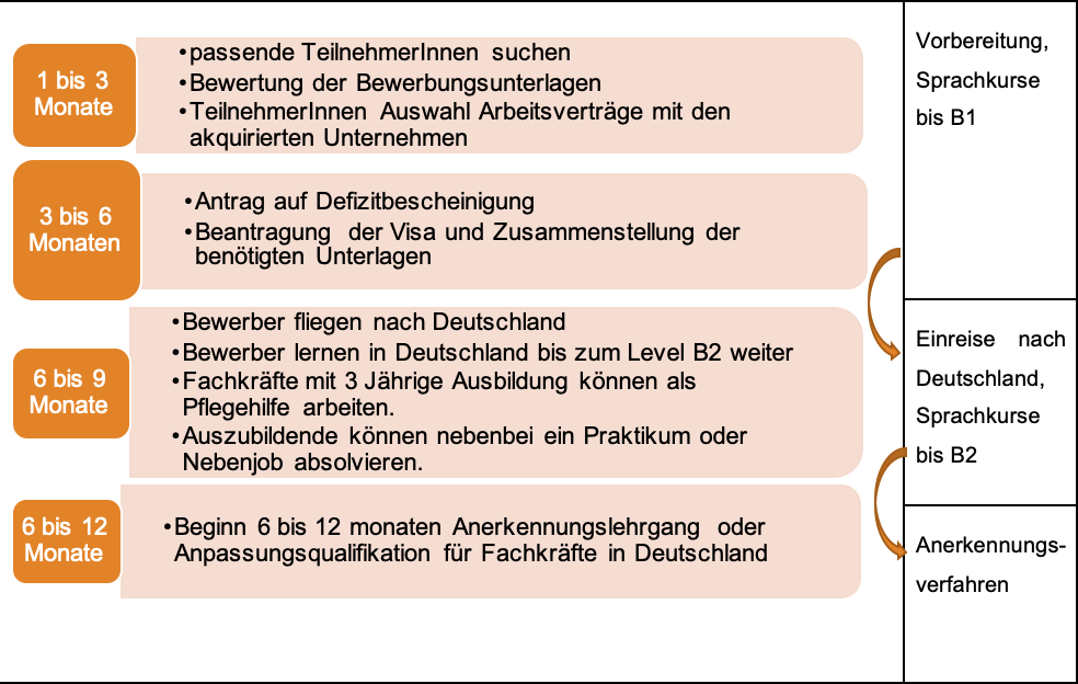 Von den zukünftigen Mitarbeitern/innen wird Engagement sowie fachliche und persönliche Qualifikation erwartet. Diese Bewerber haben das vietnamesische Abitur, lernen Deutsch bis zum B1 Sprachniveau in Vietnam (Sprachzertifikat nach dem gemeinsamen Europäischen Referenzrahmen für Sprache) und haben zusätzlich bereits eine Pflegeausbildung in Vietnam „Gesundheit- und Krankenpflege“ abgeschlossen. Alter der Fachkräfte sind zwischen 21 und 35 Jahre. Das Geschlecht ist hier nicht relevant.